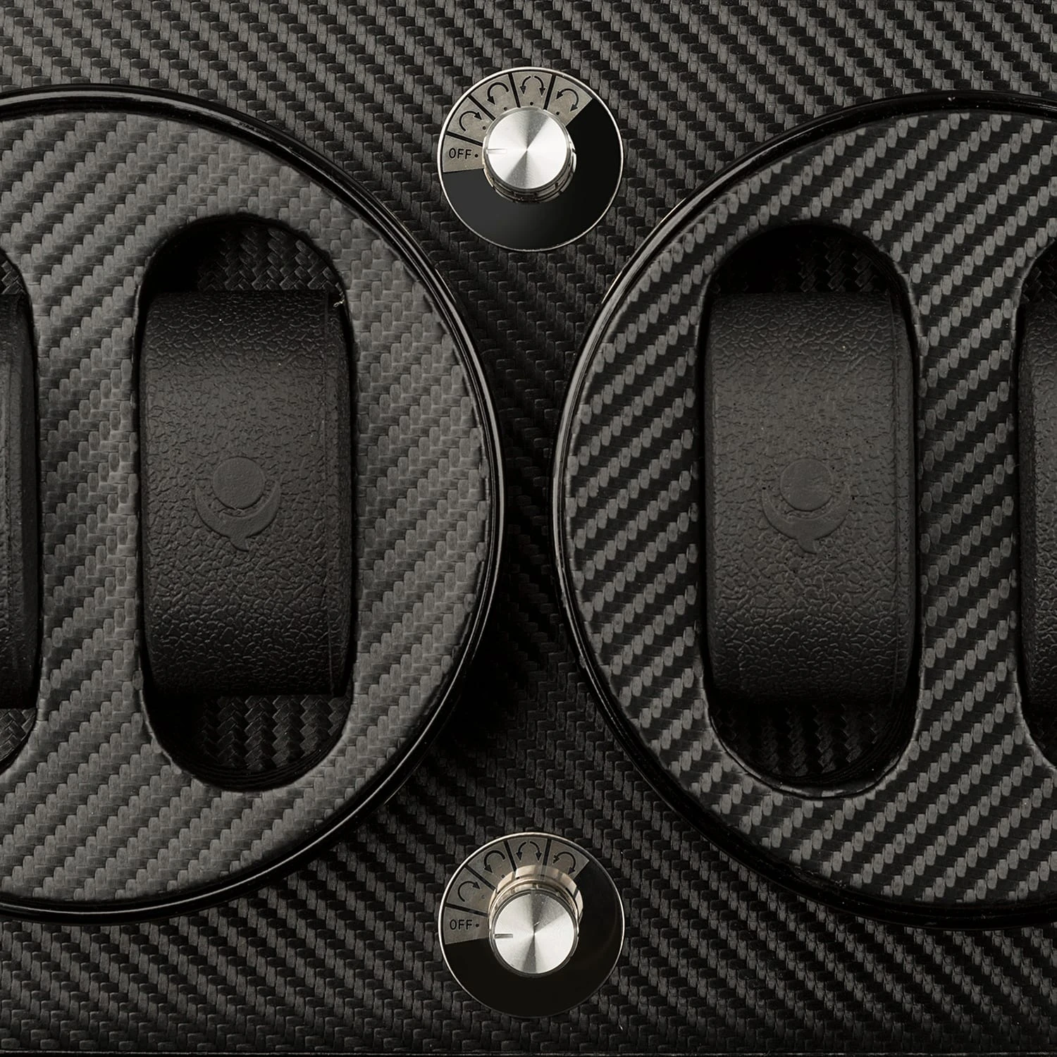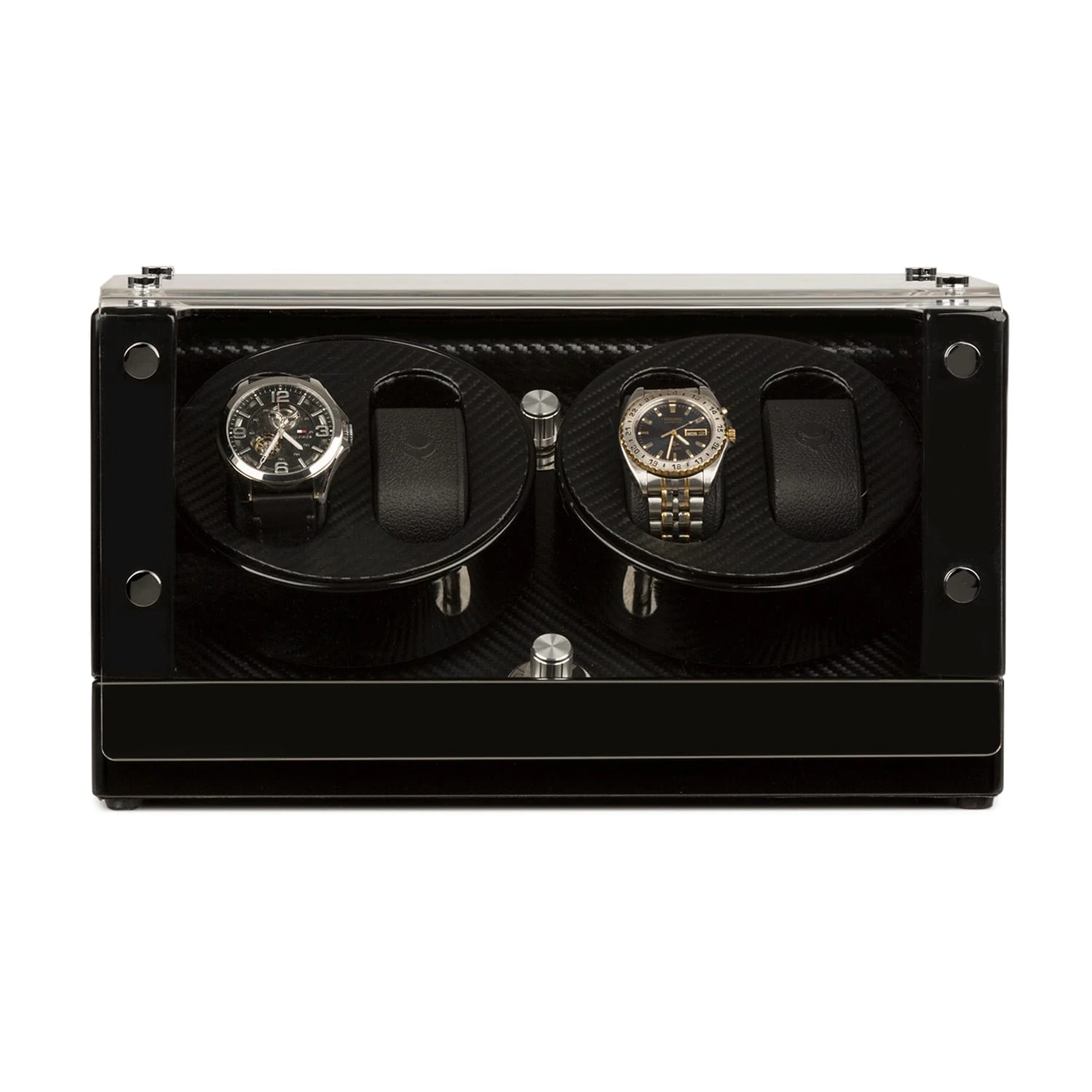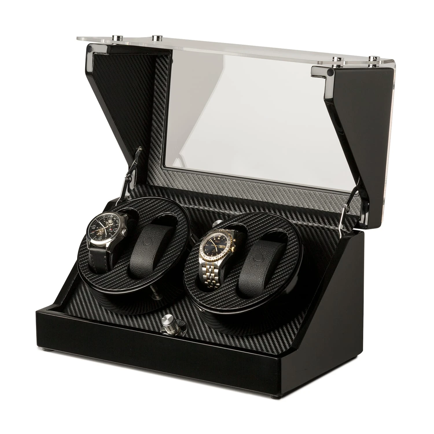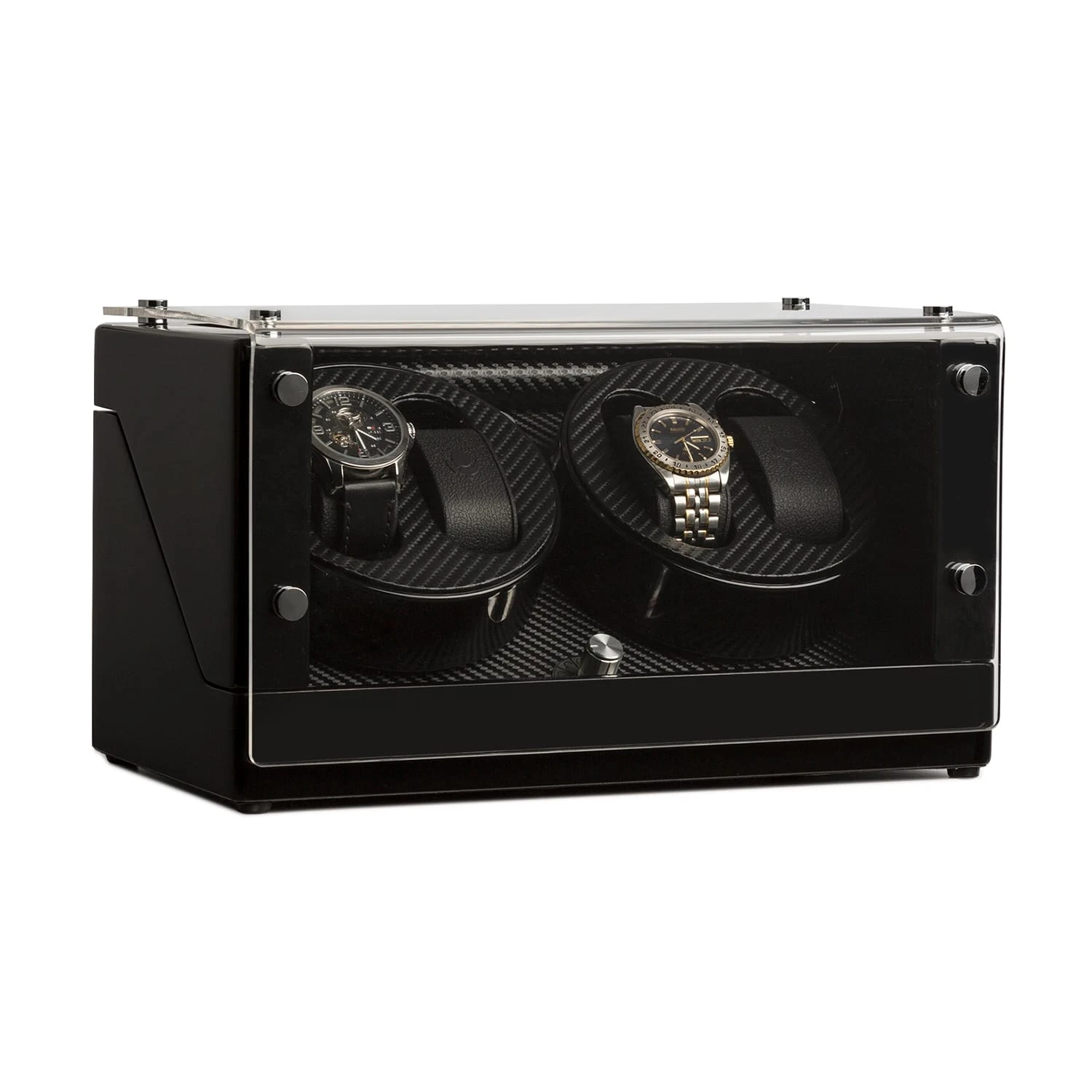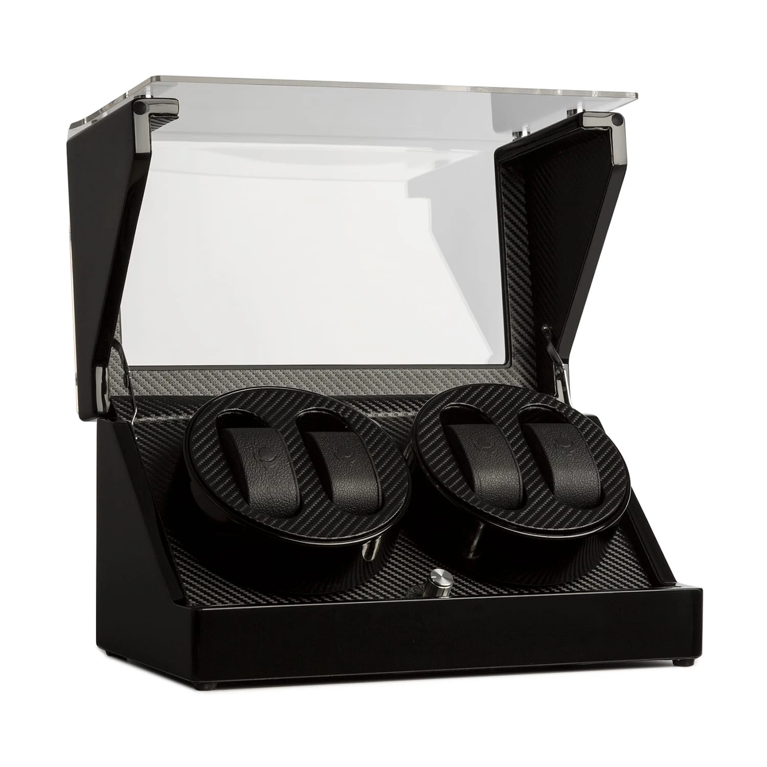 Der handgearbeitete Geräte-Korpus ist mehrschichtig mit schwarzem, mehrfach polierten Pianolack überzogen. Ein randlos verarbeitetes, großzügig geschnittenes Acrylglas-Fenster gibt freien Blick auf das Interieur, dessen feingliedrige Karbon-Optik die verwahrten Uhren mit subtil-elegantem Understatement exponiert.